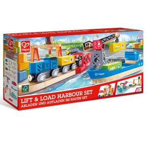 Jucarie din lemn – Set tren cu port de ridicare si incarcare