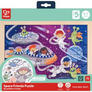 Puzzle din lemn 2 in 1 – Prietenii din Spatiu (50 piese), cu fata dubla si activitate colorare