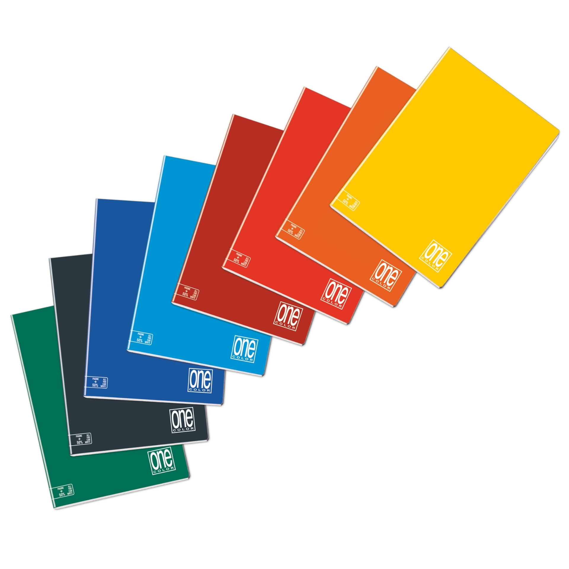 Caietele Maxi cu mai multe foi ONE COLOR „ALL YOU CAN WRITE” sunt disponibile cu hartie de 80 de grame (120 de pagini) si hartie de 100 de grame (96 de pagini), pe langa pagina de garda; sunt disponibile in toate liniile. Copertile sunt din carton de 240 de grame, imprimate in culori stralucitoare originale si laminate mat.