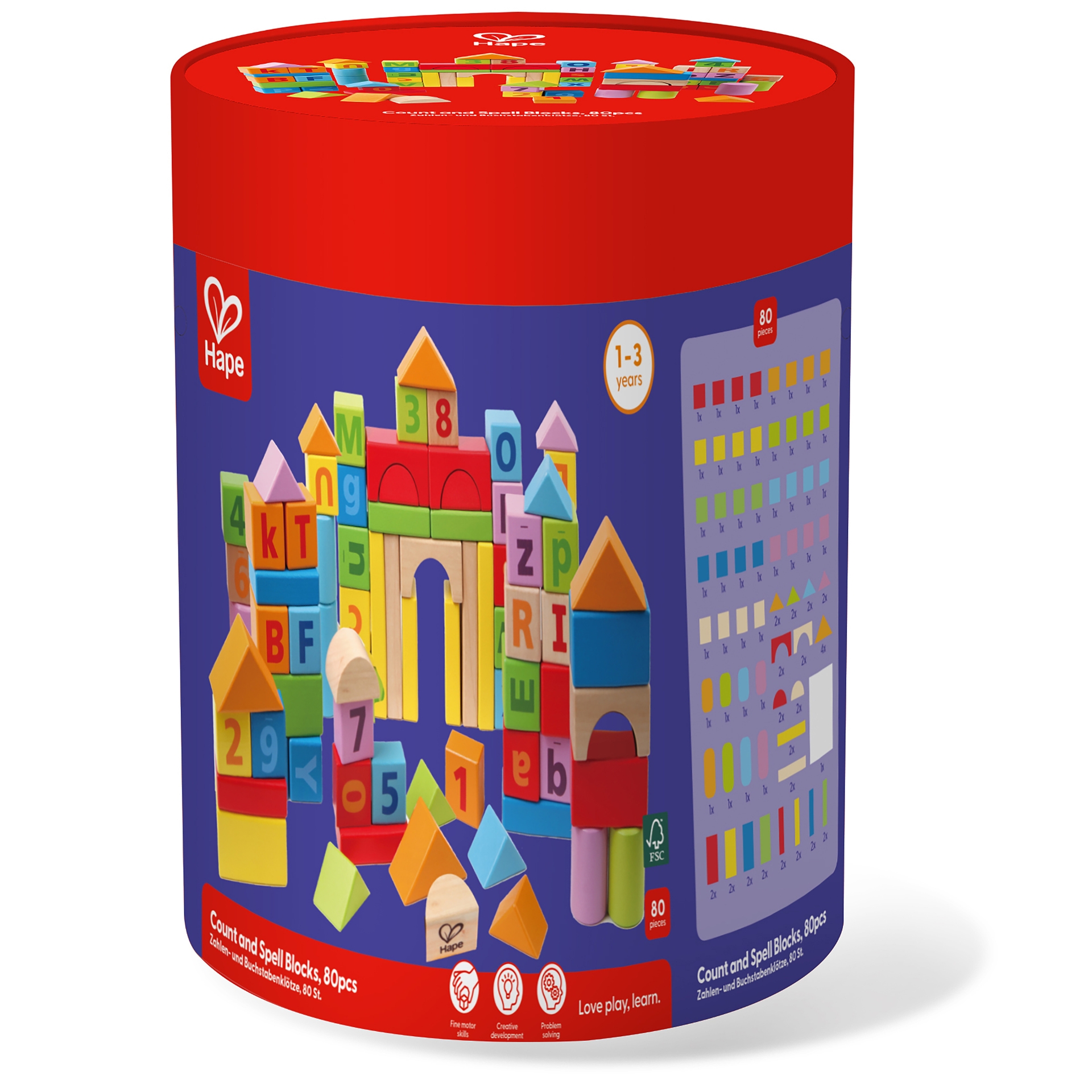 Aceste blocuri versatile de stivuire sunt dimensionate perfect pentru mainile mici si ajuta la dezvoltarea coordonarii ochi-mana, a abilitatilor motorii fine si a relatiilor spatiale. Setul de blocuri din lemn masiv de fag consta din 80 de piese in 11 forme diferite, inclusiv alfabetul A-Z si numerele 1-9.