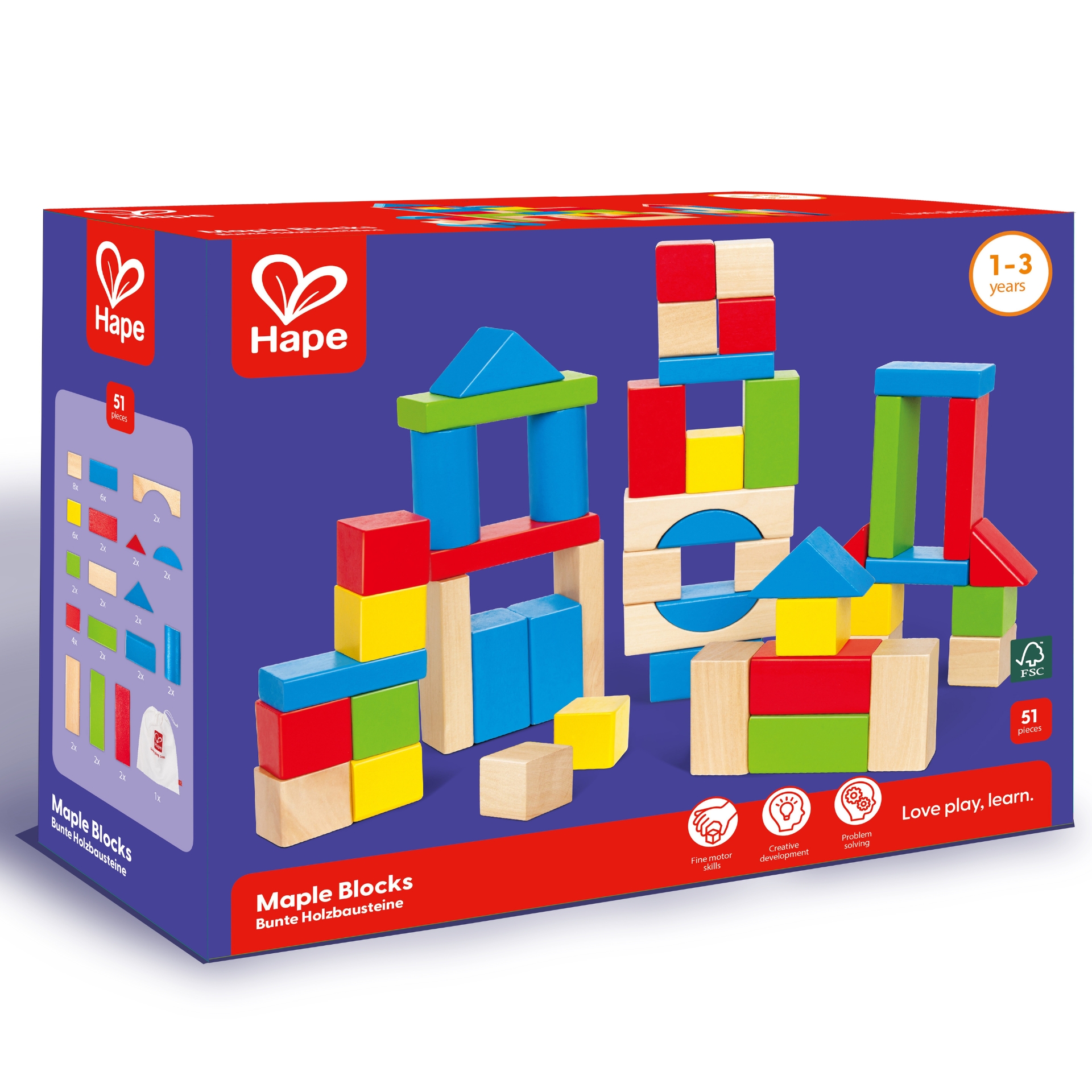 Cele 50 de blocuri colorate din lemn, ofera un cadru de joaca ideal pentru orice copil cu varsta peste 12 luni. Jocul clasic si de neinlocuit al stivuirii pieselor robuste si colorate, ce vor inspira ore intregi de satisfactie. Explorati modul in care diferite forme pot face turnuri mai inalte sau mai late.