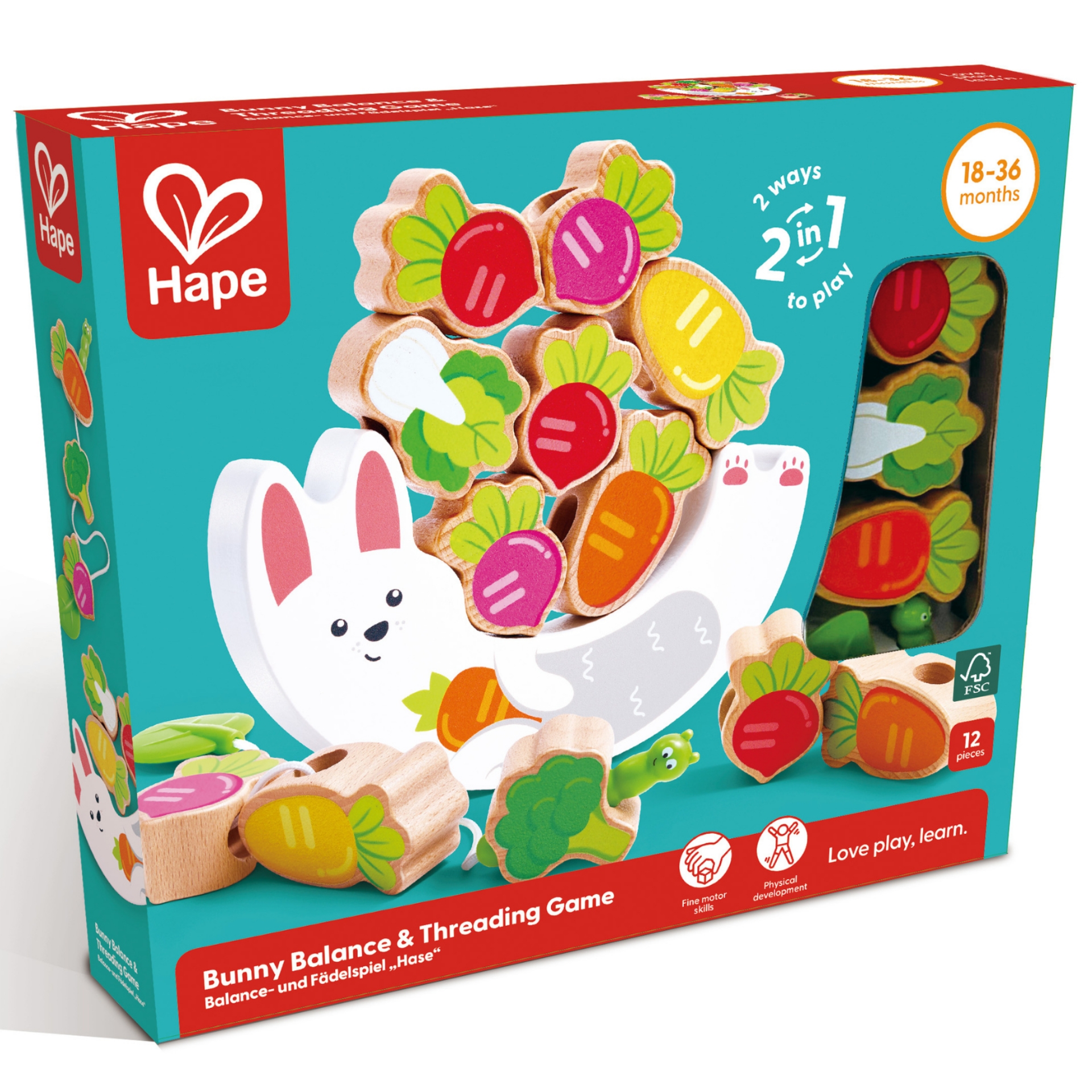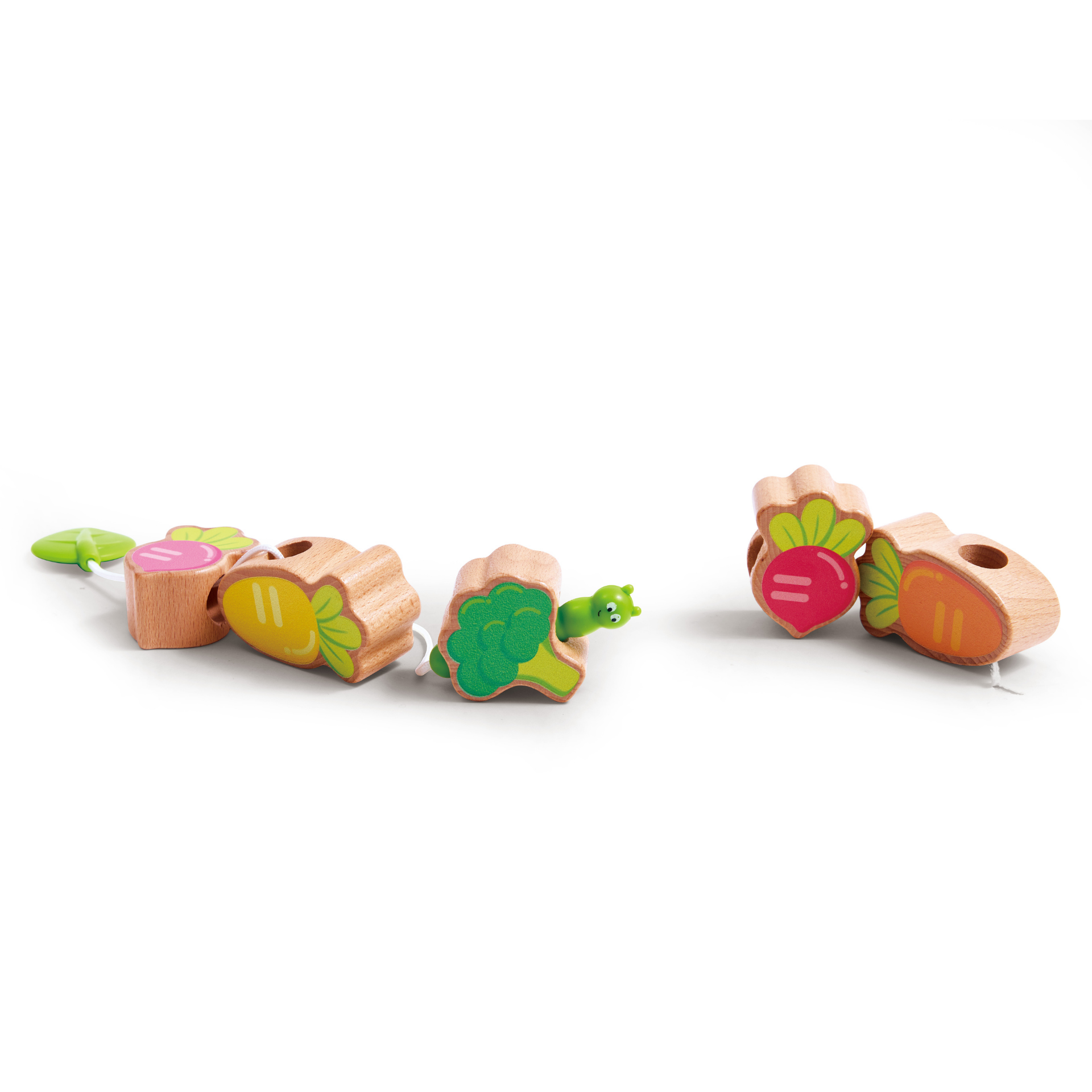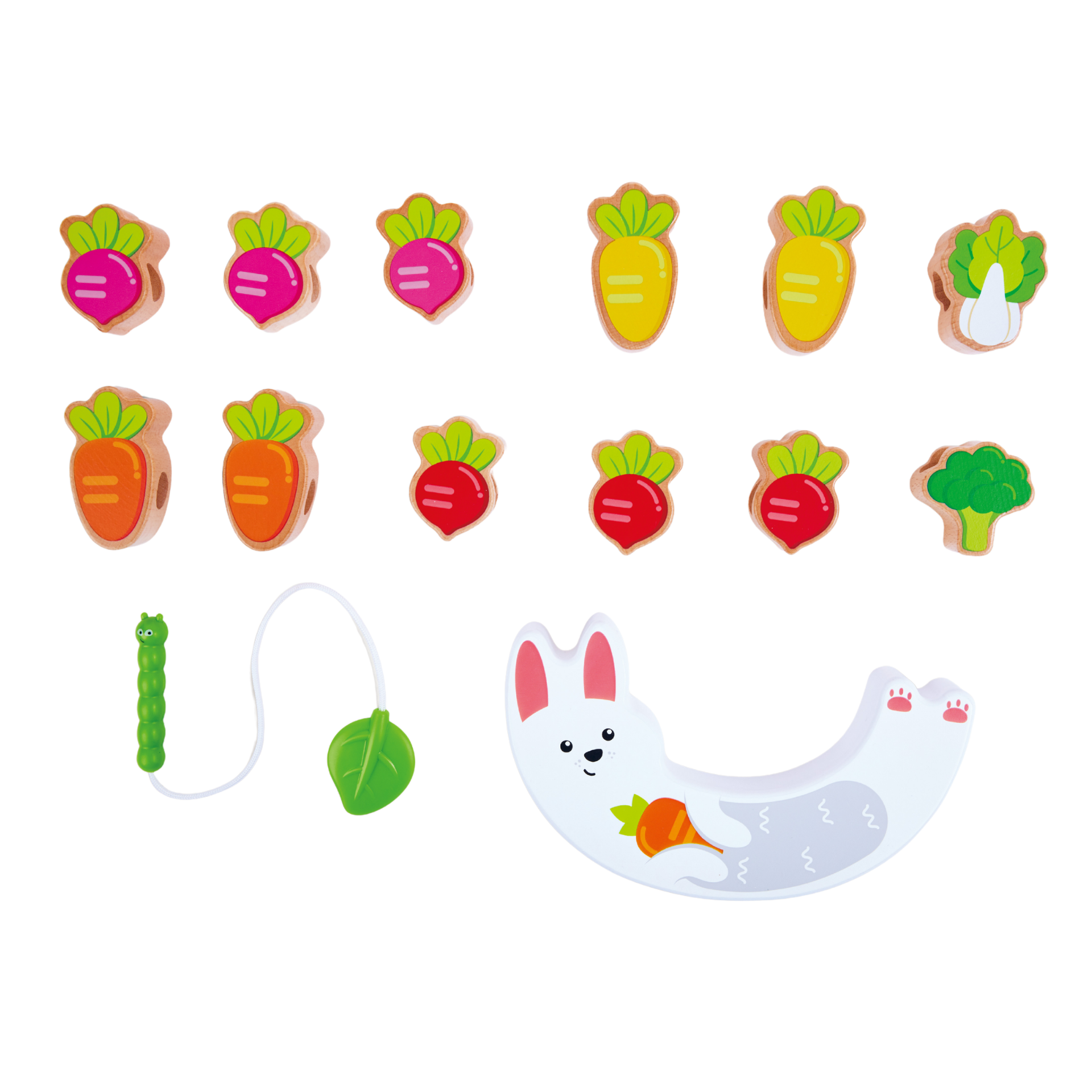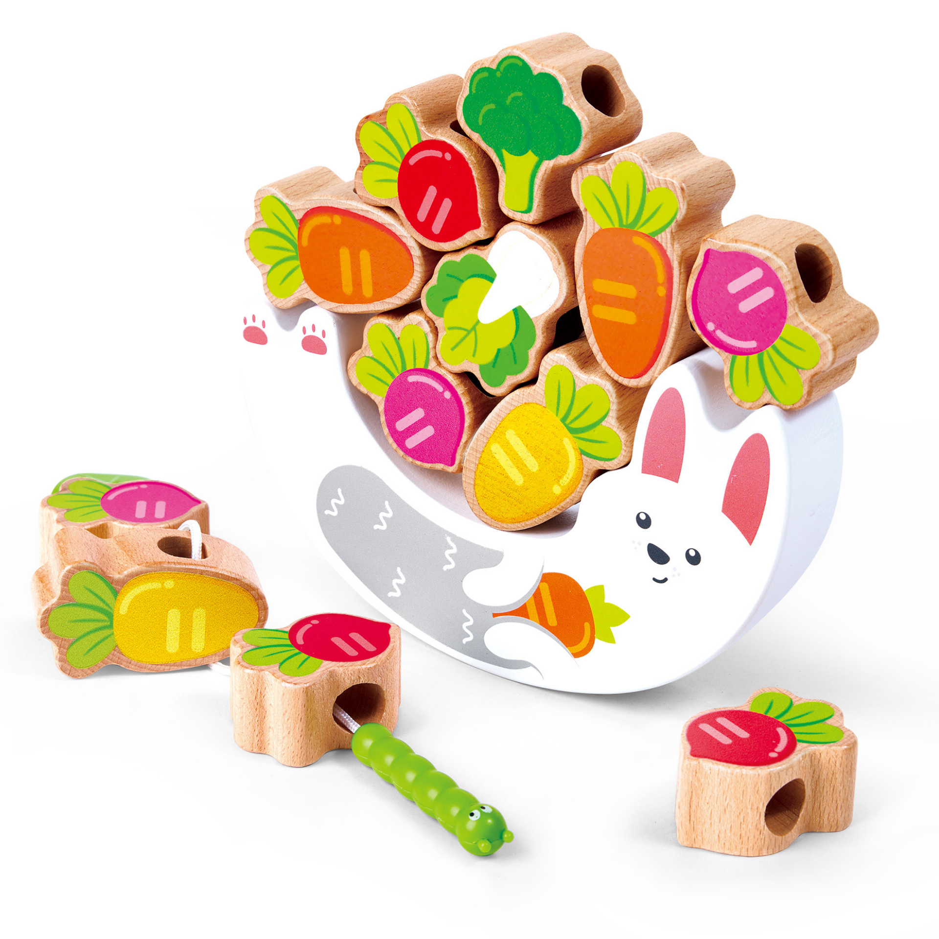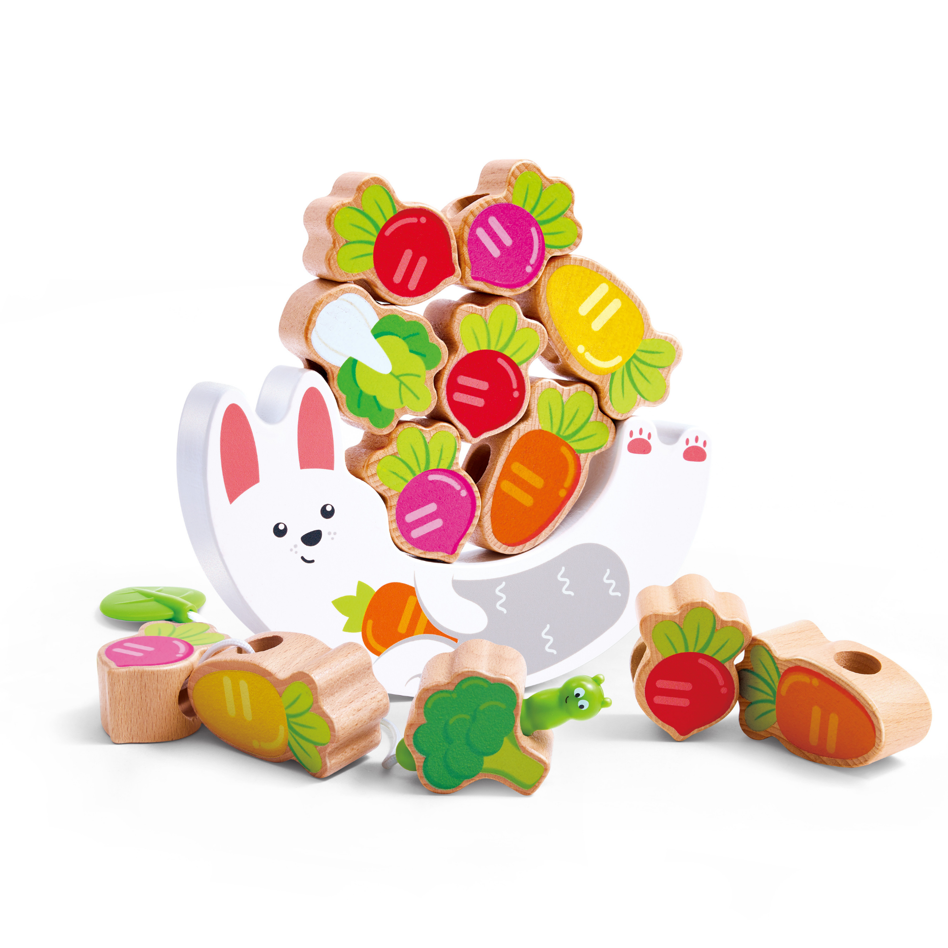 Joc din lemn 2 in 1 – Stivuiti legumele pe Iepuras si insirati legumele pe sfoara Omidei