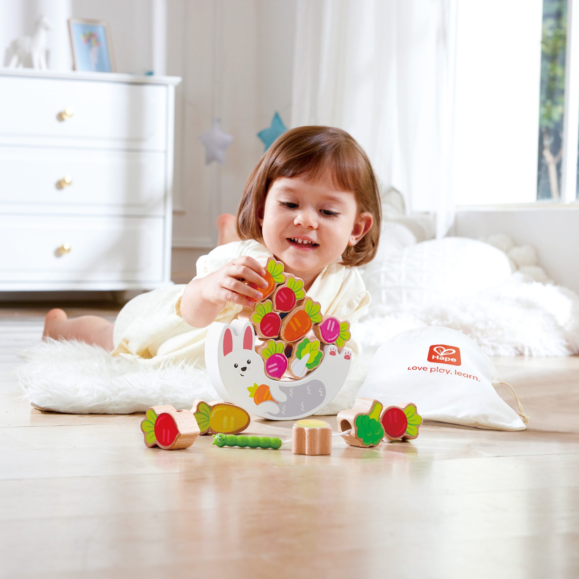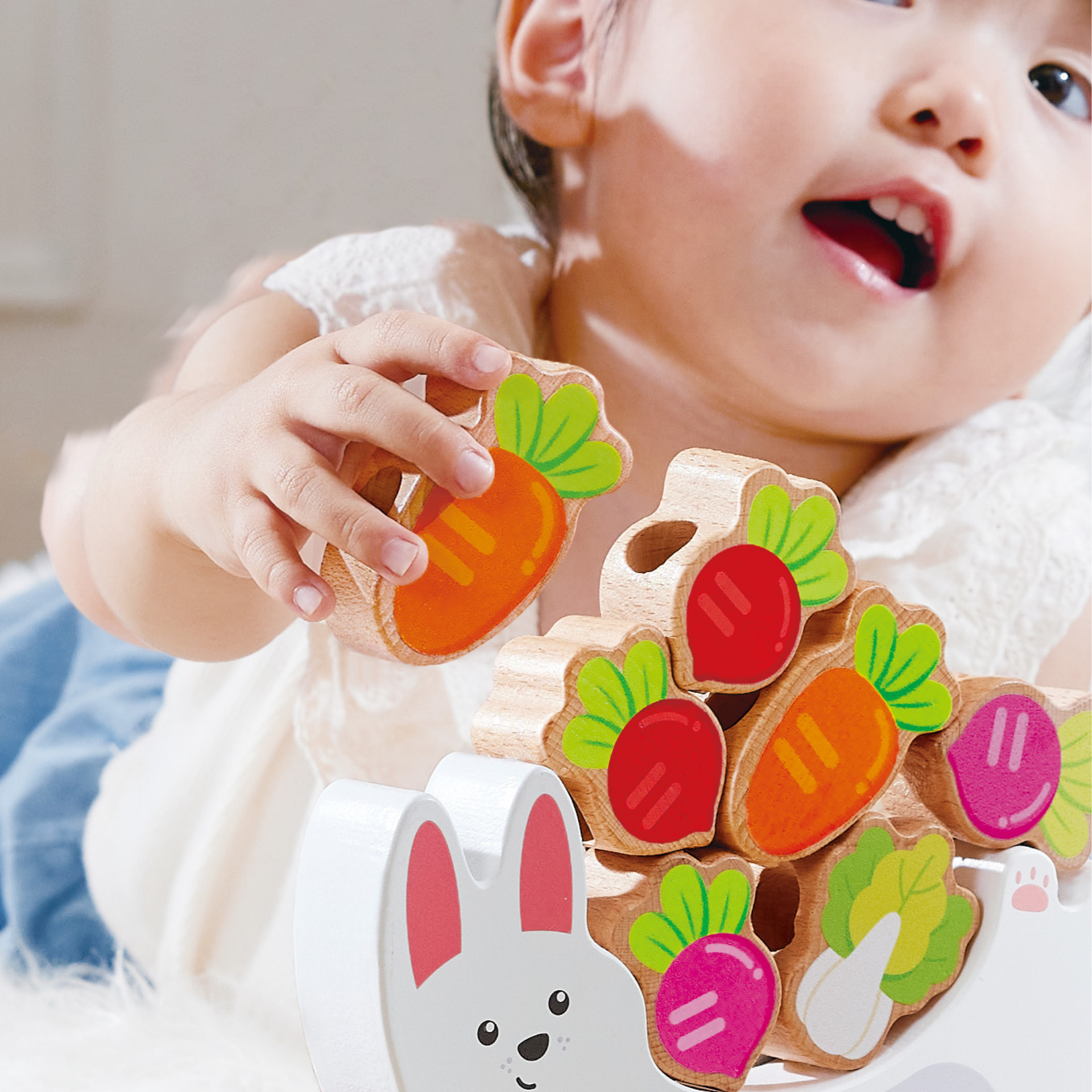 Asezati baza iepurasului si incepeti sa stivuiti legumele din lemn, apoi treceti legumele cu funia omida. Urmareste cum copiii chicotesc cu fiecare clatinare, invatand echilibrul si stabilitatea prin distractie.