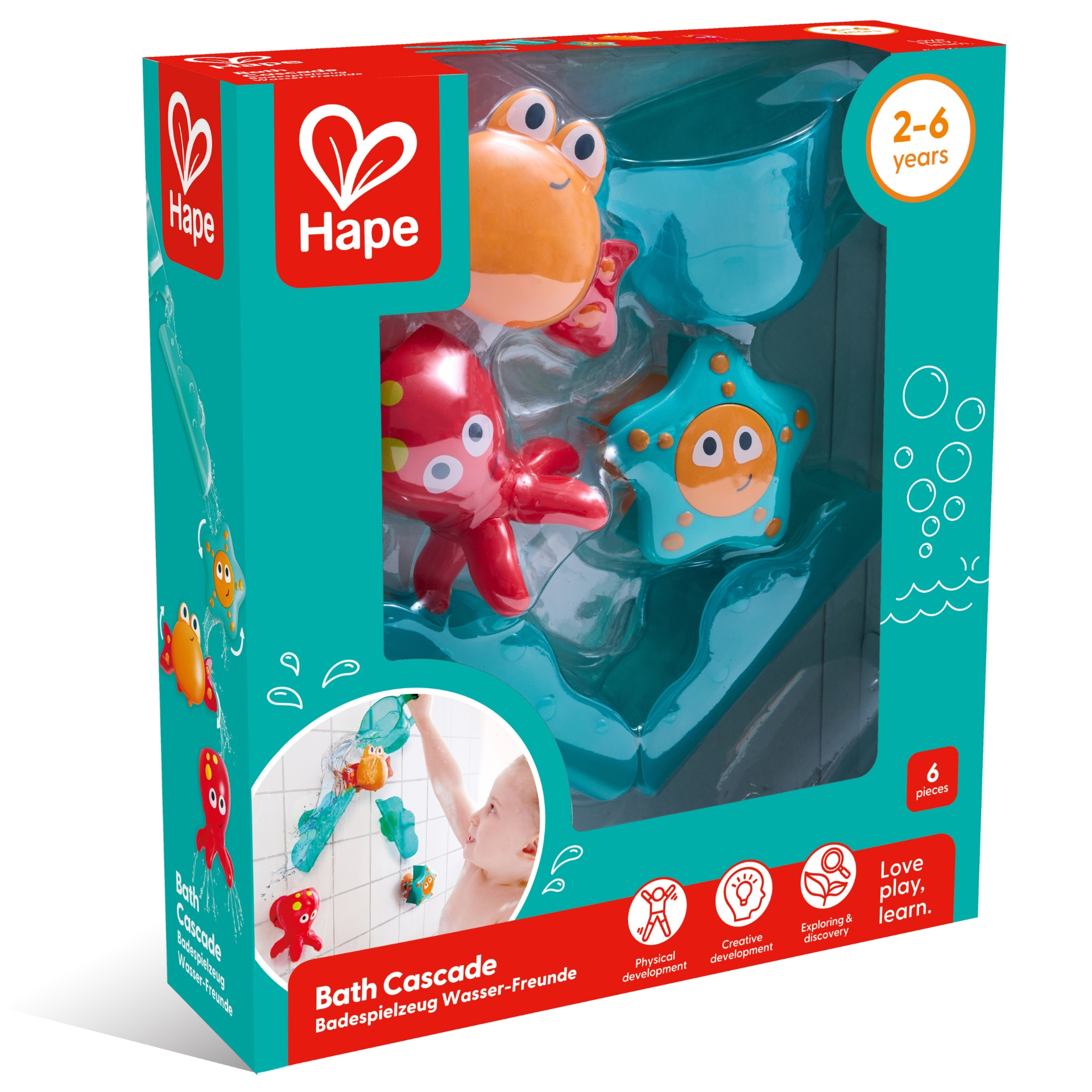 Setul de joaca pentru timpul baii se ataseaza cu usurinta la cada sau pe perete folosind ventuzele. Utilizati ulciorul cu apa pentru a turna apa peste animale si tobogane cu apa.