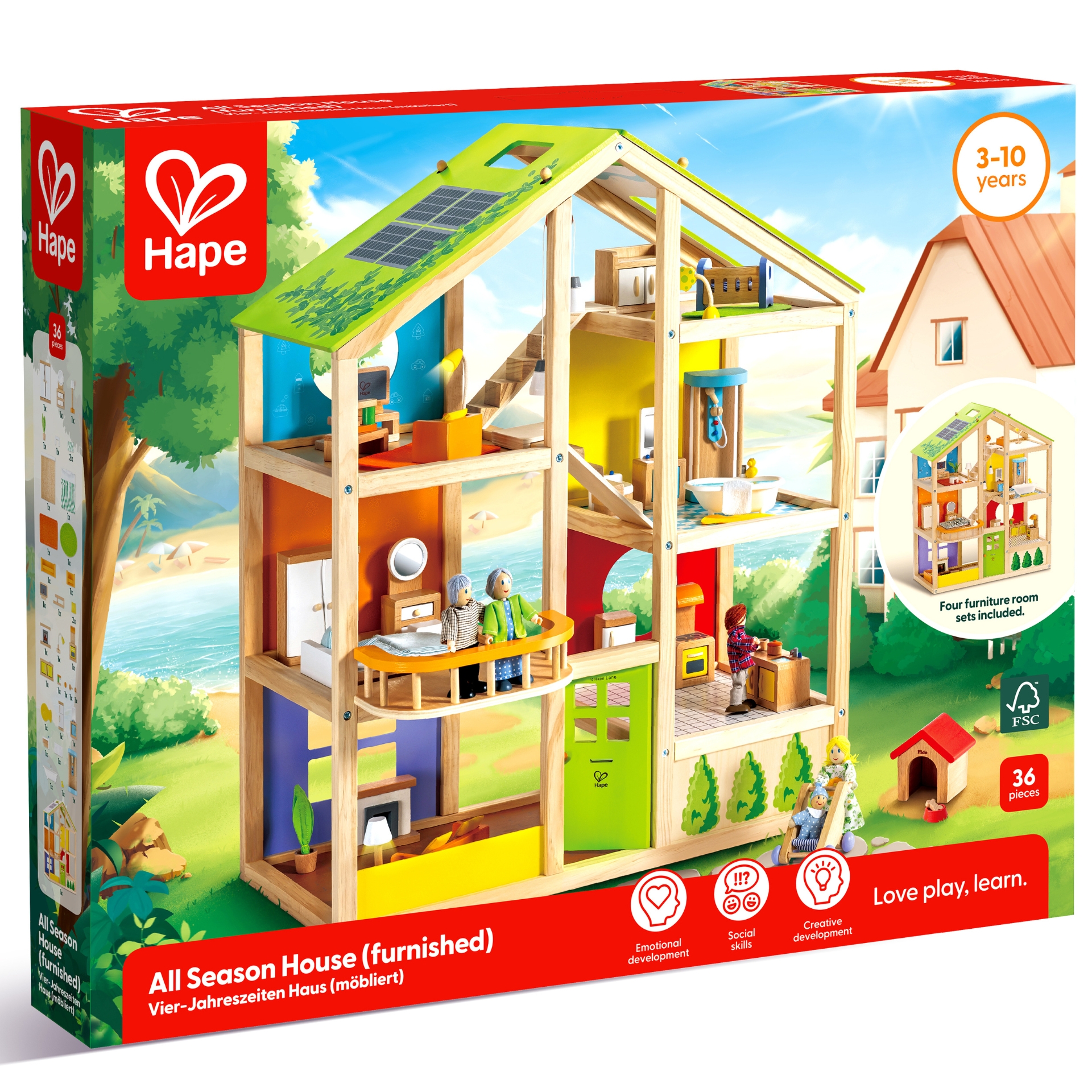 Jucarie din lemn – Casa de papusi mobilata de jucarie (36 piese) – O casa de papusi clasica din lemn cu 3 etaje, care incurajeaza jocul de rol imaginativ cu prietenii.