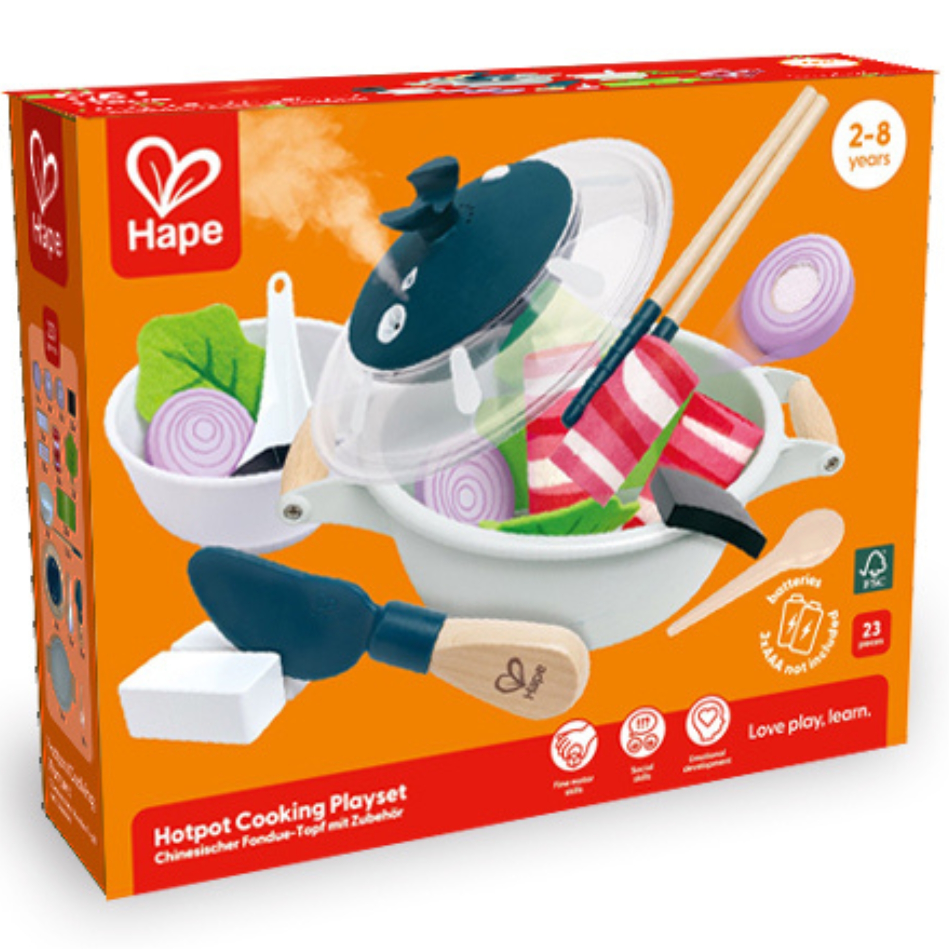 Acest set de joaca colorat include o oala, betisoare, cutit de joaca, lingura si imitatii de ingrediente proaspete. Este dragut si captivant, la fel ca si copilul tau!