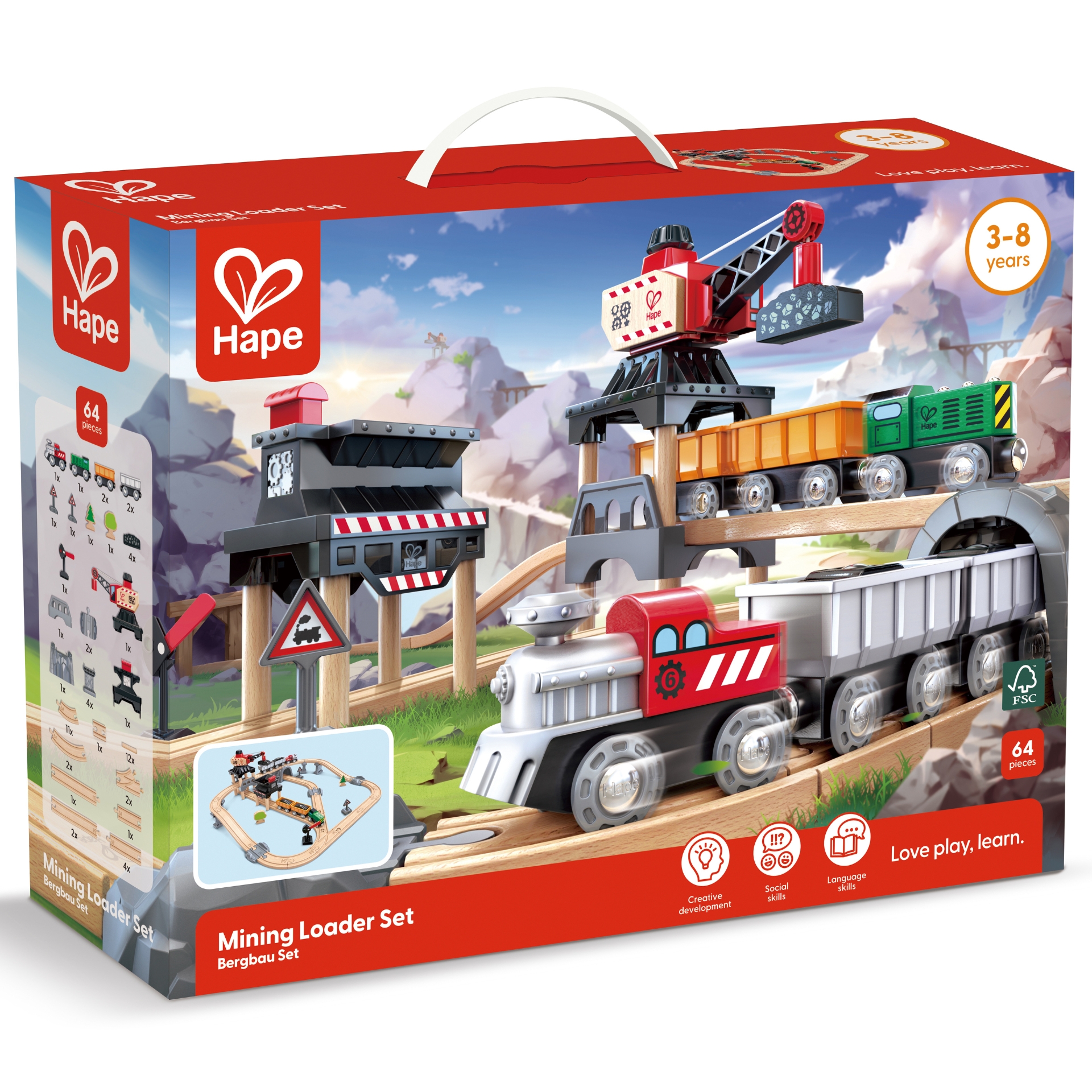 Jucarie din lemn – Tren si incarcator minier (64 piese) – Setul de cale ferata din lemn include o macara cu palan magnetic pentru mutarea marfurilor in si in jos din tren sau intr-o gramada. Incarcati trenul folosind incarcatorul actionat cu butoane.