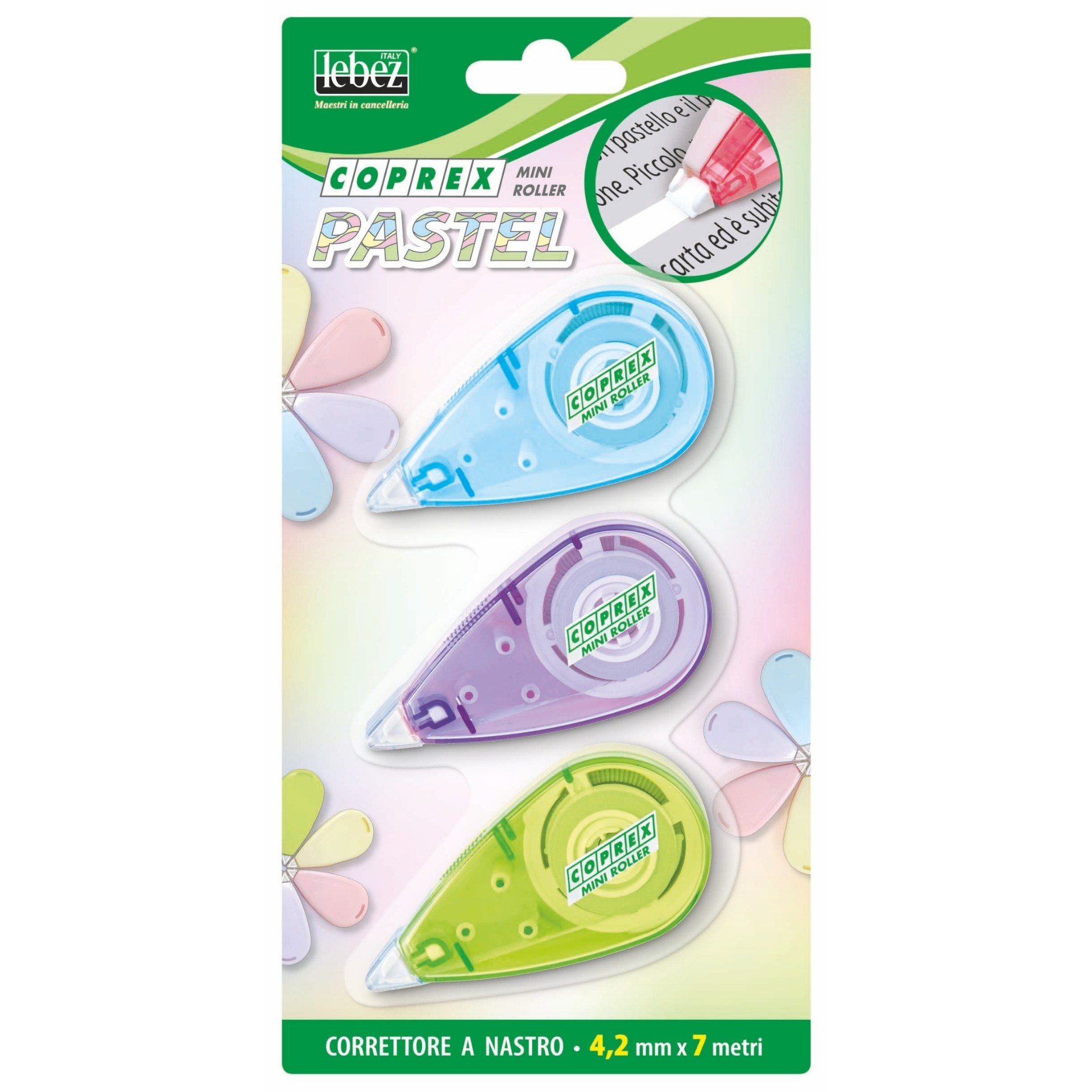 Mini corector cu banda 4.2 mm x 7 m Pastel – blister 3 buc