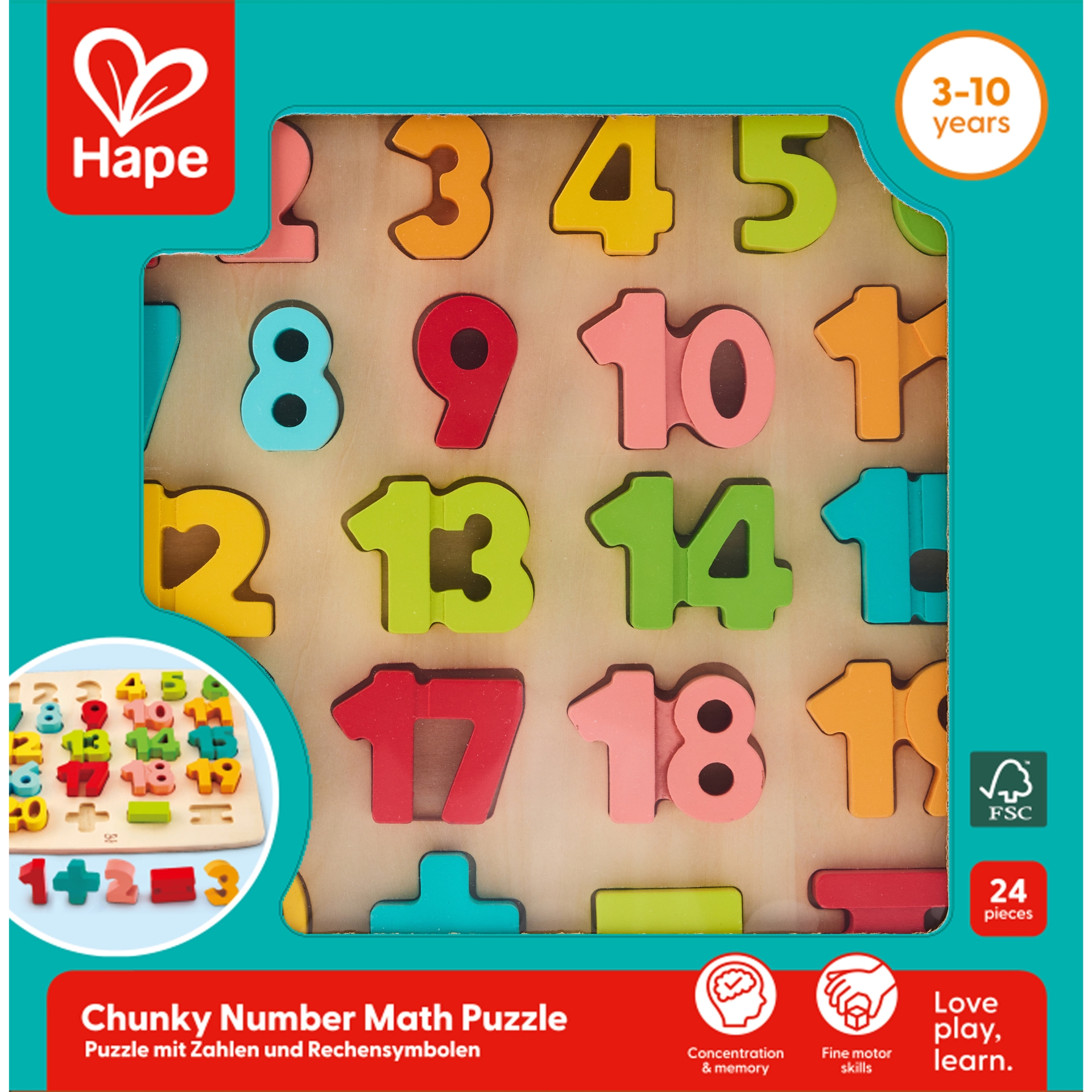 Este usor sa numeri 1-2-3! Noul puzzle cu numere groase de la Hape cu siguranta va va incanta copilul! Piesele mari se potrivesc perfect in mainile mici. Poti afla unde merg numerele de pe tabla? Potriviti numerele cu conturul corect de pe tabla de la numerele 1 la 20! Excelent pentru invatarea numerelor.